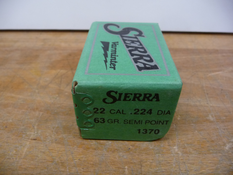 Hier wird z.B. eine geschlossene Packung mit 100 Stück Sierra Geschossen, .224, 63 grain, TM-kegelspitz, Varminter angeboten.