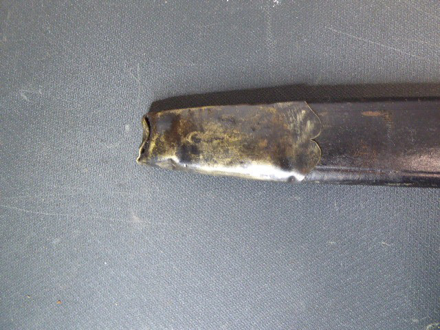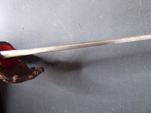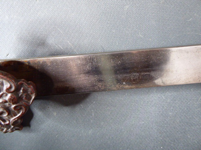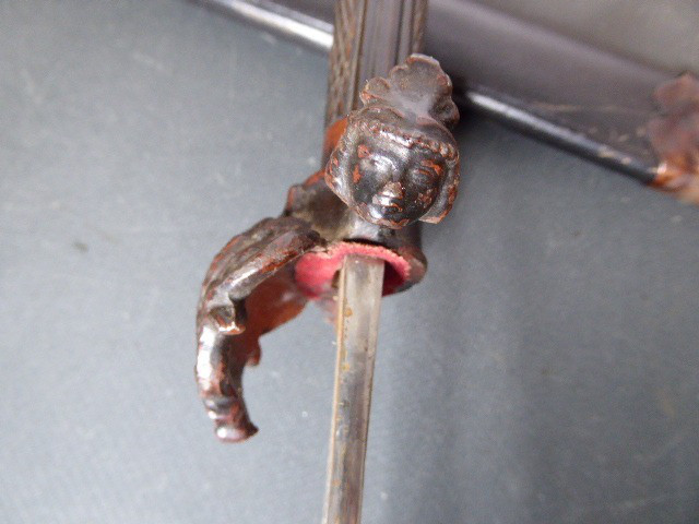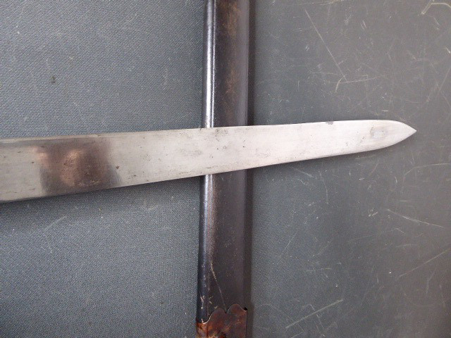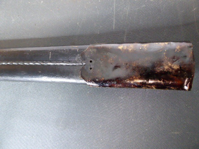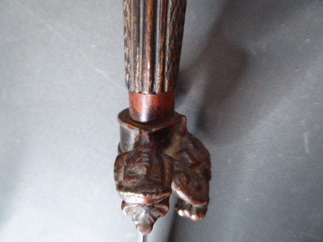 Aus meiner Sammlung gebe ich, ein alter Interessanten langen Hirschfänger mit Löwenkopf ca.19. Jhd. mit Scheide ab. Griff Holz/Horn?. Gefäß aus Bronze oder Tombac. Muschel, Parierung, mit Maskaronen. Griffkappe als Löwenkopf. Stabile einschneidige Klinge ohne Hersteller. Lederscheide mit Beschläge. Kenner werden es sicherlich wissen wo das Teil herstammt und getragen wurde. Das Teil ist im Guten Sammelwürdigen Zustand. Alles andere entnehmen Sie Bitte den Fotos. Gesamtlänge: 71 cm, ohne Scheide: 70 cm, Klingenlänge: 55 cm, Klingenbreite: 3,3 cm. Kann zu jederzeit bei mir besichtigt werden. Privatauktion keine Rücknahme und Garantie.