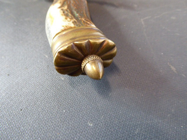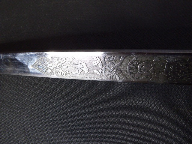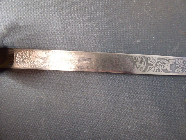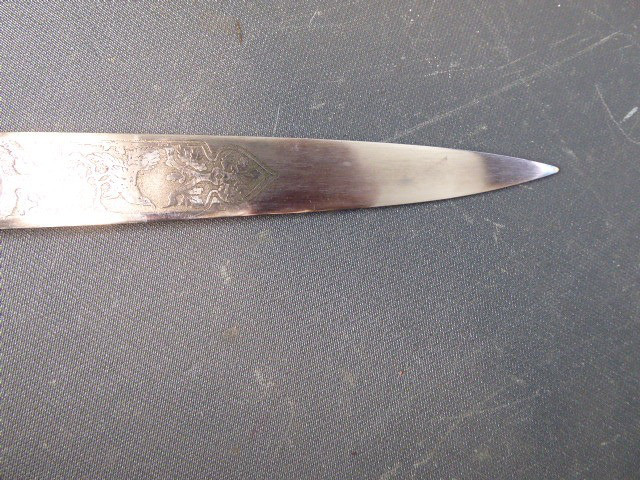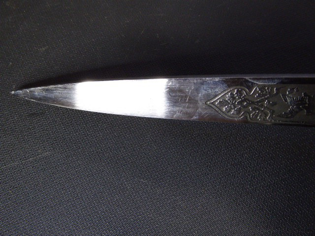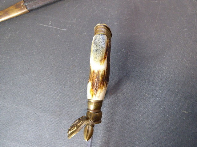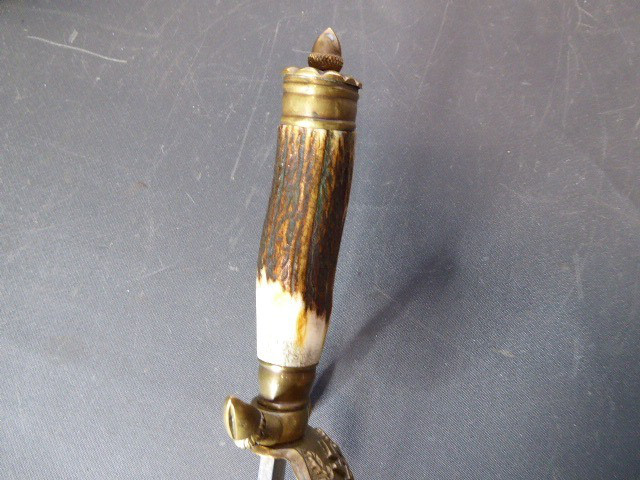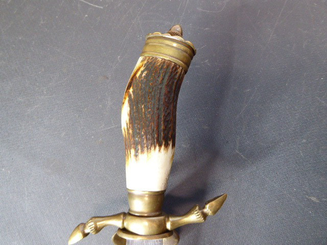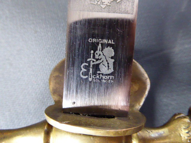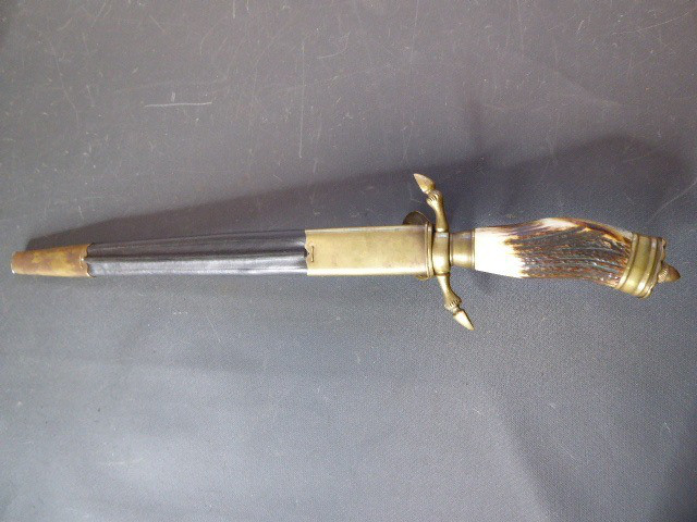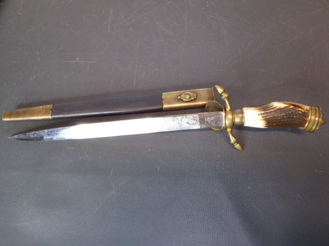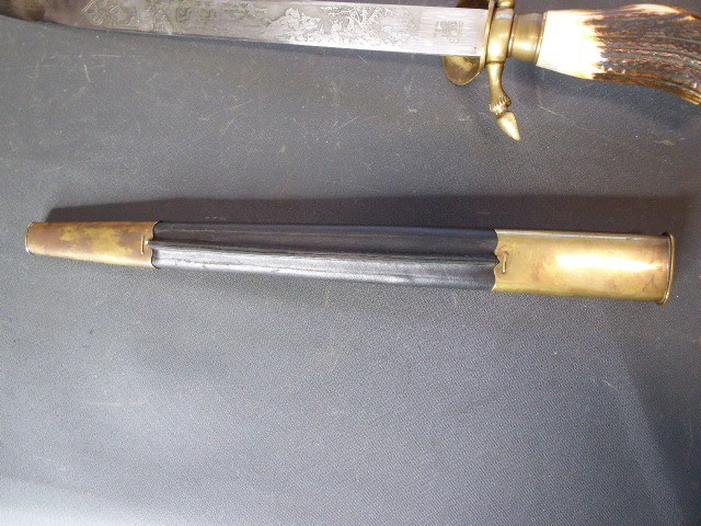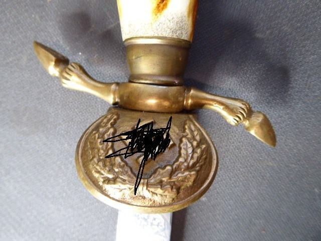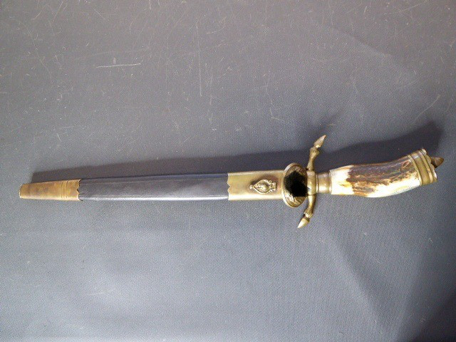 Aus meiner Sammlung gebe ich, ein 3. Reich Hirschfänger mit Scheide Hersteller ORIGINAL EICKHORN SOLINGEN Zeitgenössig? ab. Griff Hirschhorn. Gefäß mehrteilig aus Messing. Stabile einschneidige Klinge beidseitig mit Jagdlichen Ätzungen. Hersteller ORIGINAL EICKHORN SOLINGEN. Lederscheide mit Messingbeschläge. Kenner werden es sicherlich wissen ob das Teil Zeitgenössig ist, ich kann es nicht mit Sicherheit sagen. Das Teil ist im Guten Sammelwürdigen Zustand. Alles andere entnehmen Sie Bitte den Fotos. Gesamtlänge: 48 cm, ohne Scheide: 47,5 cm, Klingenlänge: 33,1 cm, Klingenbreite: 2,2 cm. Kann zu jederzeit bei mir besichtigt werden. Privatauktion keine Rücknahme und Garantie.