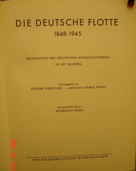 "Die Deutsche Flotte " zeigt die jemals im Dienst befindlichen Schiffe in einwandfreien Bilddokumenten; es sind hier leider einige Seiten mit den Dickschiffen herausgetrennt worden. Zu Beginn wird eine Liste der Verluste in zwei Weltkriegen gebracht, danach eine Ausarbeitung "Gedanken zum Flottenbau" von Friedrich Ruge, gefolgt von einer historischen Betrachtung "Deutsche Kriegsschiffe von 1848 - 1945" und einem Register.