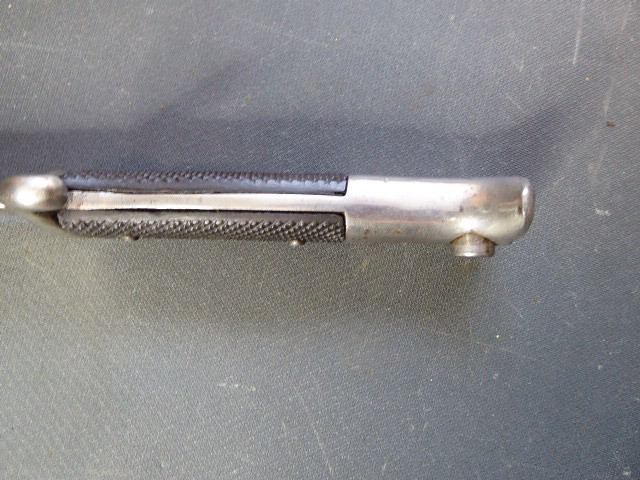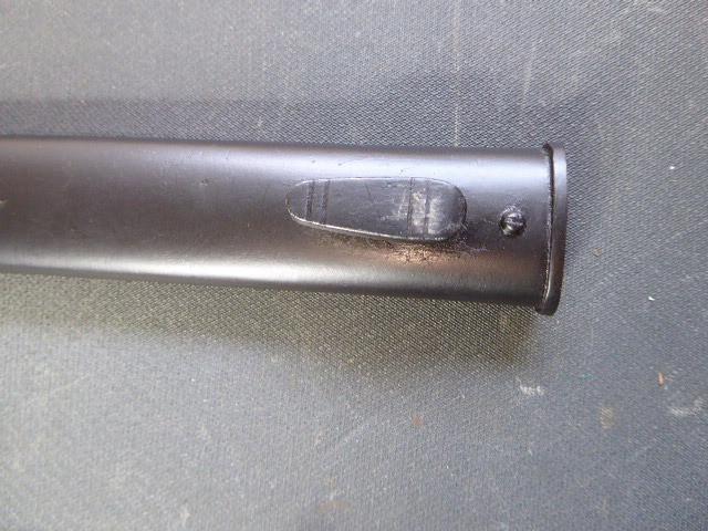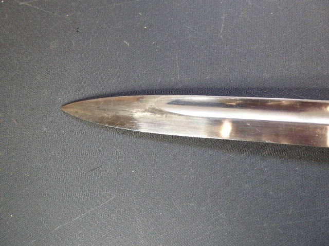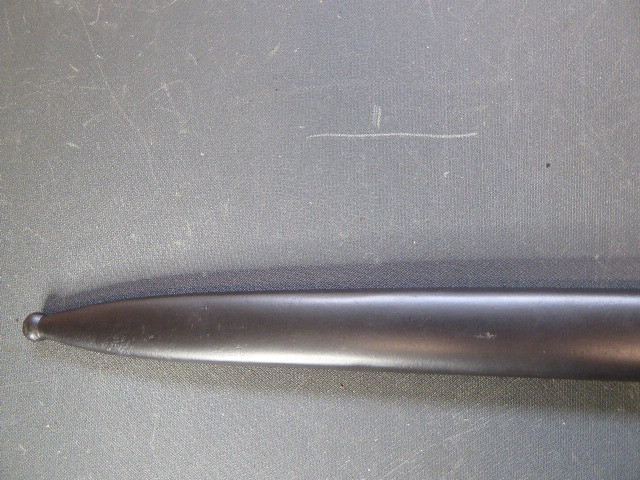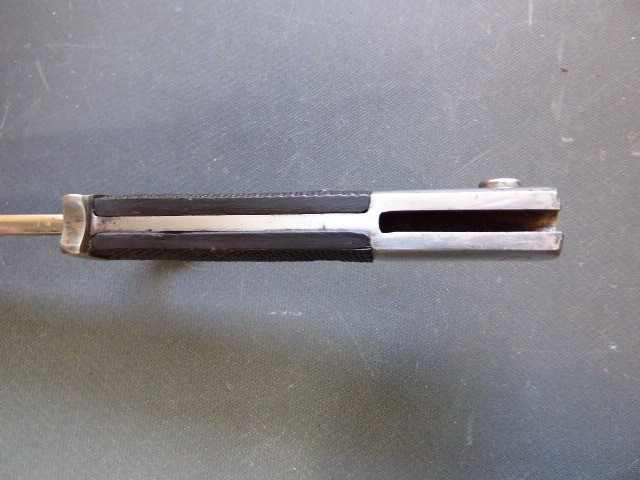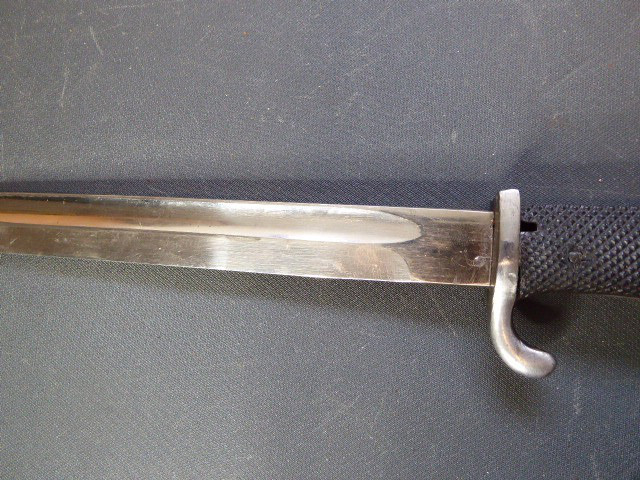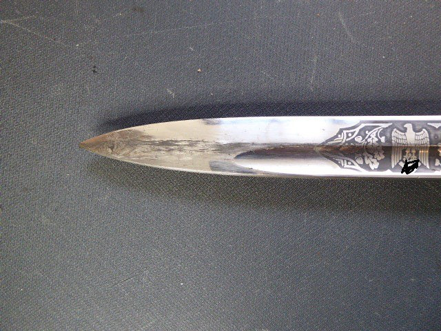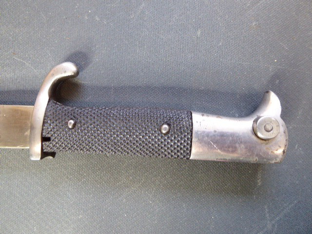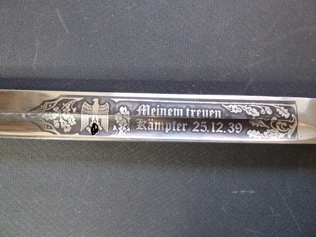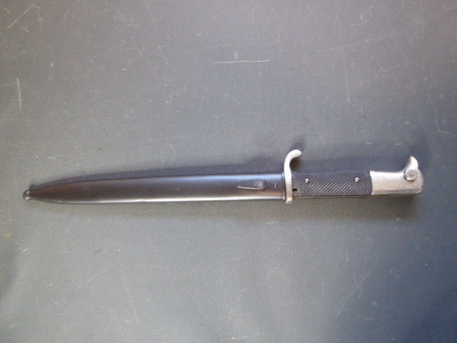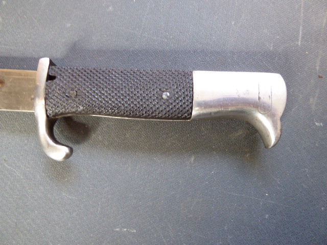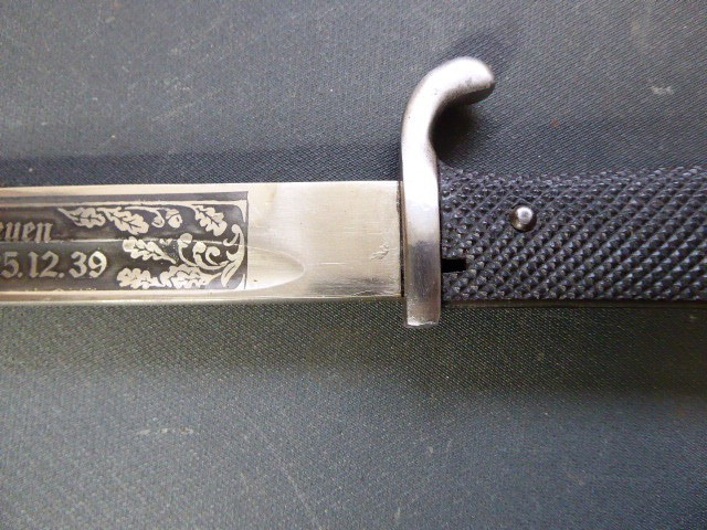 Aus meiner Sammlung gebe ich, ein seltenes 3. Reich Extra Seitengewehr Stilisierter Vogel Knauf einseitig mit Ätzung ab. Griff zwei geriffelte schwarze Bakelit Schalen, Knauf als Stilisierten Vogel Kopf. Stabile einschneidige Klinge, einseitig mit Hochätzung Meinem treuen Kämpfer 25. 12. 39 ohne Hersteller. Scheide Stahl wurde mal sicherlich nachlackiert. Das Teil ist im Guten Sammelwürdigen Zustand. Alles andere entnehmen Sie Bitte den Fotos. Gesamtlänge: 57,5 cm, ohne Scheide: 55,2 cm, Klingenlänge: 43 cm, Klingenbreite: 2,3 cm. Kann zu jederzeit bei mir besichtigt werden. Privatauktion keine Rücknahme und Garantie.