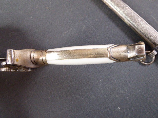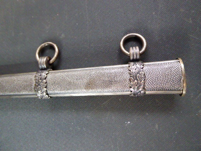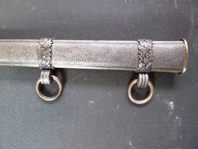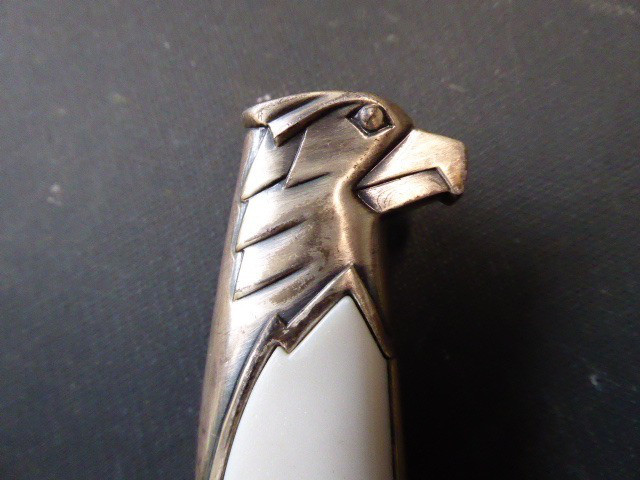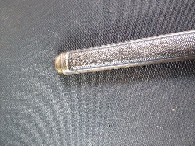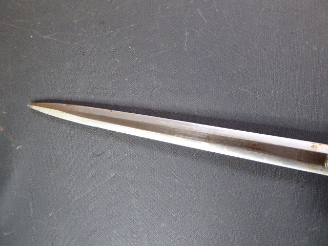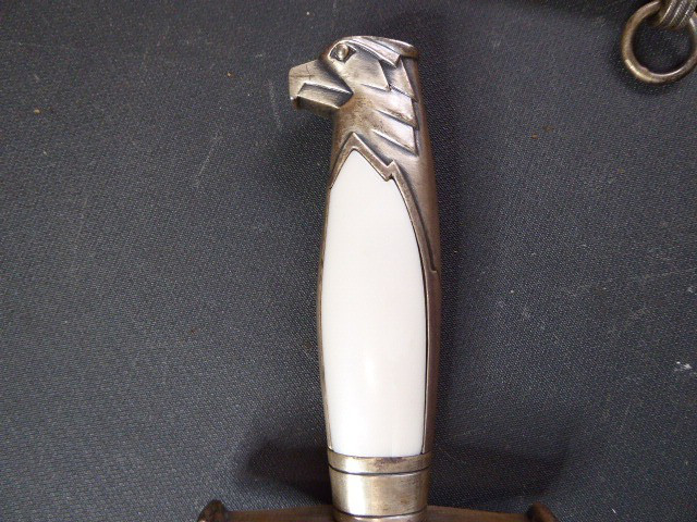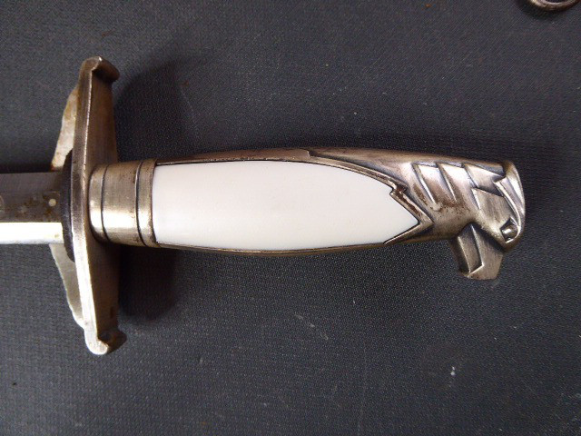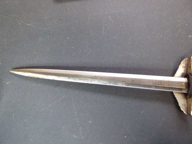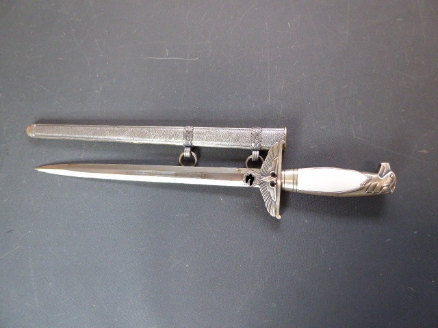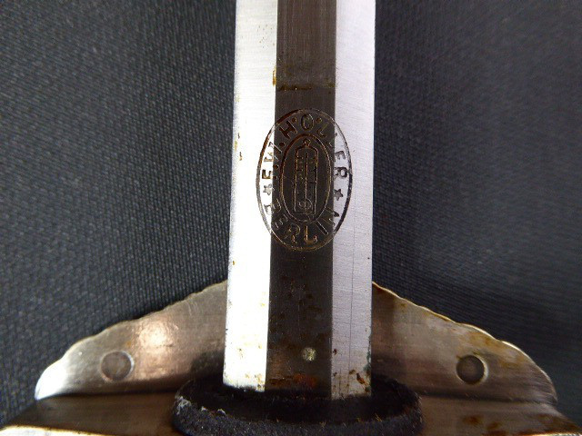 Aus meiner Sammlung gebe ich, einen 3. Reich Diplomaten Dolch als späte sehr Gute Fertigung Hersteller F.W. HÖLLER ab. Knauf als Stilisierten Vogel Kopf. Stabile zweischneidige Klinge, mit Hersteller. Das Teil ist als Belegstück für selten zu bekommenden Originalen Dolch, im sehr Guten Sammelwürdigen Zustand. Alles andere entnehmen Sie Bitte den Fotos. Gesamtlänge: 38,7 cm, ohne Scheide: 36,5 cm, Klingenlänge: 25,8 cm, Klingenbreite: 1,7 cm. Kann zu jederzeit bei mir besichtigt werden. Privatauktion keine Rücknahme und Garantie.