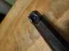 Die Handstütze weist einen Bruch im Holz auf, der fachgerecht verleimt wurde.