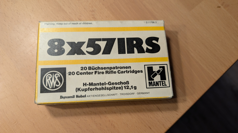 biete 19 Schuss RWS-Munition im Kaliber 8x57 IRS an mit 12,1gr schwerem H- Mantel -kupferhohlspitz-geschoss.