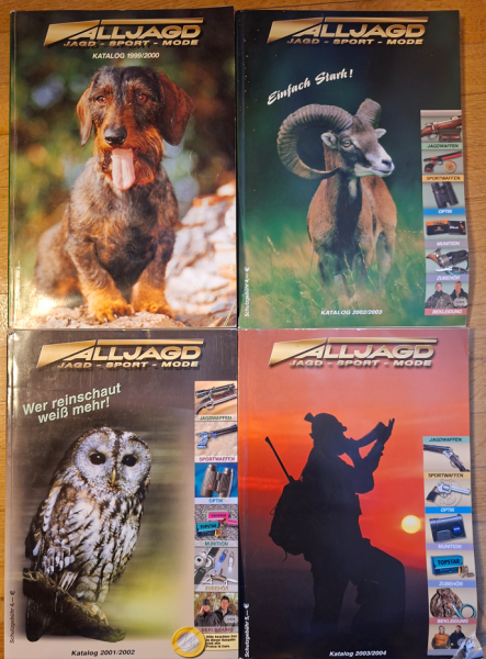 Historische AllJagd Kataloge. Es handelt sich um die Hauptkataloge 1999/2000, 2001/2002, 2002/2003 und 2003/2004. Hoher Informationsgehalt!