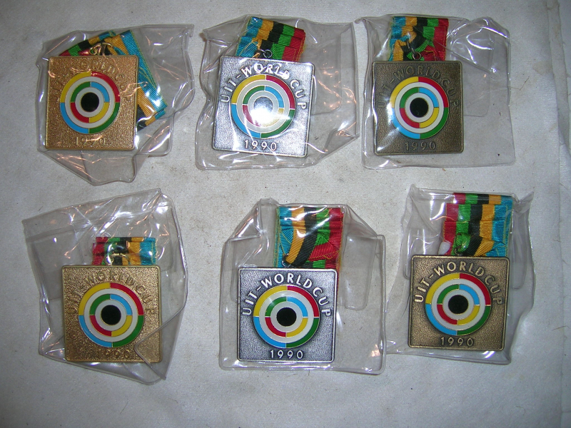 Biete zwei Medaillensätze vom UIT-Weltcup 1990 in Suhl. Die Medaillen wurden nie ausgegeben und sind noch in der originalen Verpackung. Viel Erfolg beim Bieten!