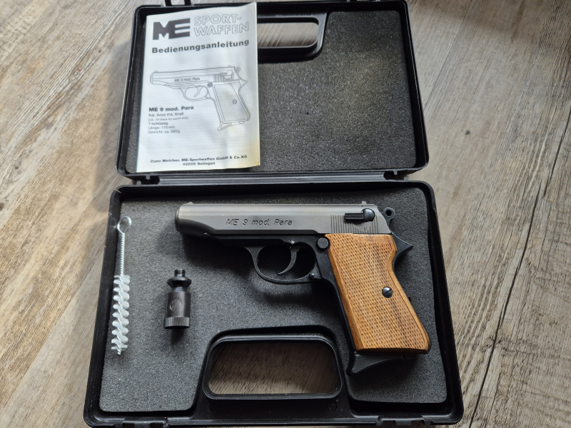 Zum Verkauf steht eine sehr schöne ME 9 Para mit Holzgriffschalen. Die Waffe funktioniert einwandfrei und ist in einem super Zustand. Selbst habe ich nicht damit geschossen und würde sagen das prinzipiell sehr wenig, vielleicht bis garnicht damit geschossen wurde. Das kann ich aber nich garantieren.
