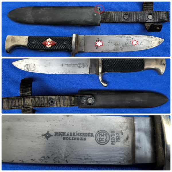 Zum Verkauf kommt dieses gebrauchte, tolle Fahrtenmesser im guten Zustand, von dem extrem seltenen Blankwaffenhersteller RICH.ABR.HERDER RZM M7/18 aus SOLINGEN. Es befindet sich in einem guten Zustand mit Gebrauchsspuren, da es ja auch benutzt wurde. Die Klinge hat eine schöne Patina, länge 140mm. Stoßleder ist OK. Hersteller und Devise gut lesbar. Die Scheide kam wohl später dazu, hat eine schöne Brünierung und zwei innenliegende Haltefedern, am Scheidenmund eine kleine Einkerbung, siehe roten Kreis. Trageleder Top. Privatverkauf, ohne Gewährleistung, Rücknahme und Garantie