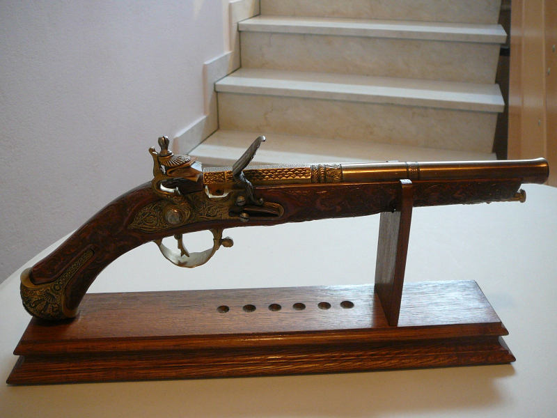 Im Auftrag aus Erbmasse, Deko Steinschloßpistole, Hersteller ?, glatter 12mm Lauf, Schloß ok, Waffe ist 41cm und der Lauf 25cm lang, schön verziert, Zustand gut, Präsentationsständer ist nicht Bestandteil der Auktion, Wie immer keine Garantie oder Rücknahme