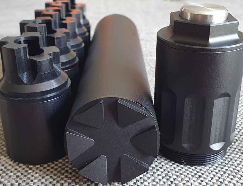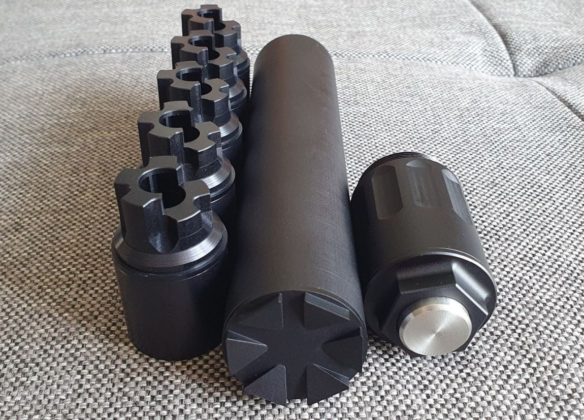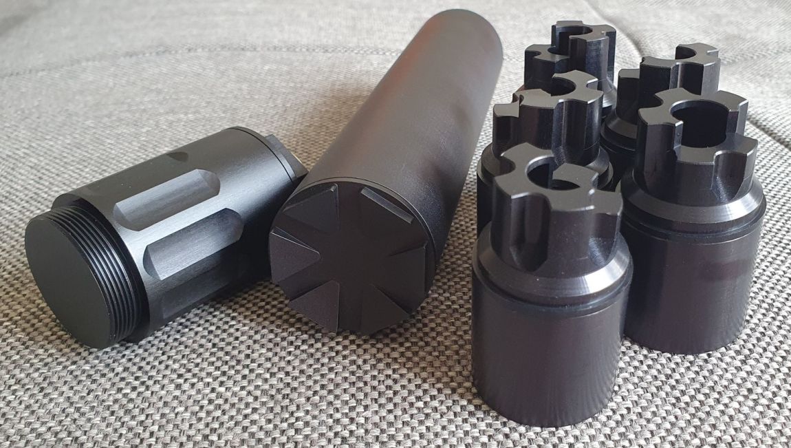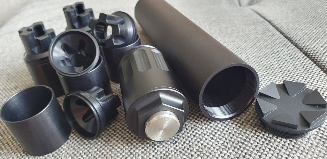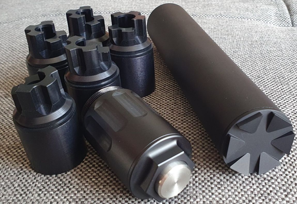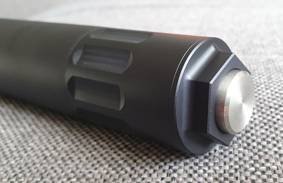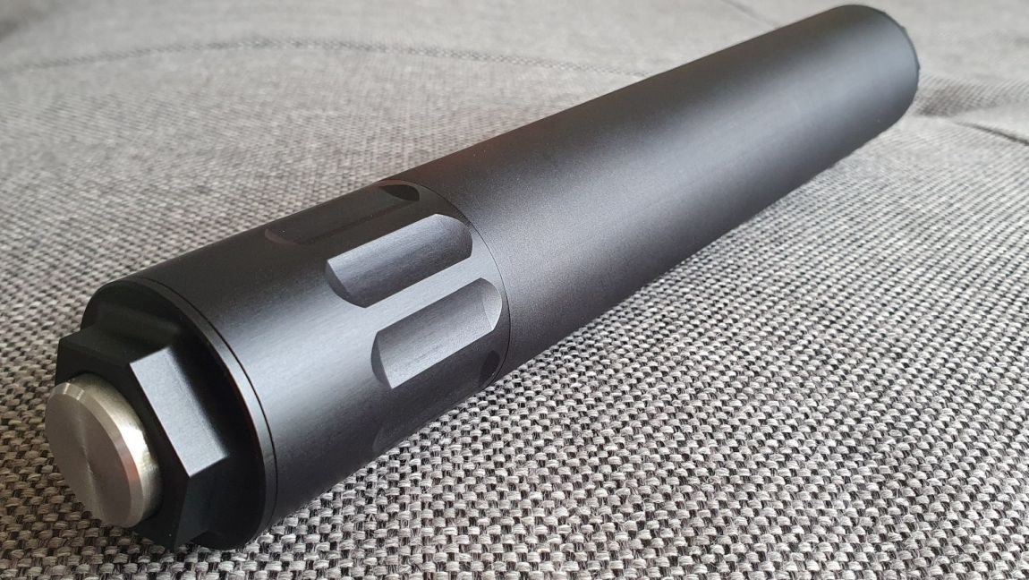 Es ist kein Anschlussgewinde, keine Durchbohrung und kein Ausschussloch vorhanden. Es ist daher unmöglich den Dämpfer an einer Waffe zu benutzen!