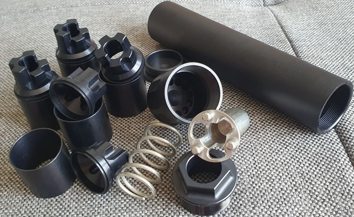 Der Preis bezieht sich immer auf ein komplettes Deko Schalldämpfer-Set bestehend aus Gehäuserohr, Abschlusskappe, fünf Diffusoreinsätzen, fünf Distanzrohren, Boostergehäuse, Boostereinsatz, Feder und Boosterkappe.