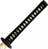 Die Tsuka aus Holz ist mit schwarzer Baumwolle über echter Rochenhaut (Same) umwickelt und verfügt über goldene Menuki und zwei Bambus-Mekugi für eine stabile Befestigung an der Nakago.