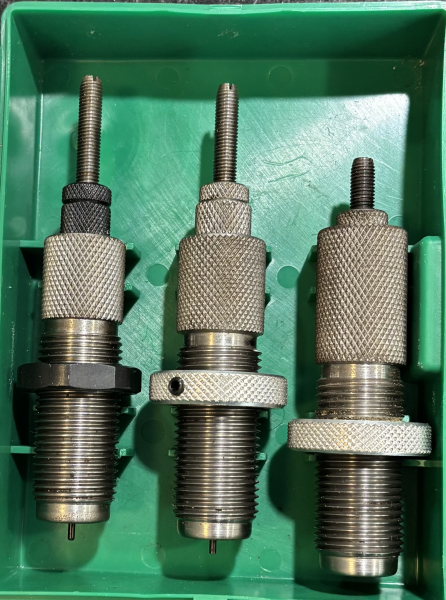 RCBS 7/5mm S/R Vollkalibriermatrizenset 33501, mit zusätzlicher Halskalibriermatrize (auf dem Foto links), alles gebraucht! Mit deutlichen Gebrauchsspuren. Über die Funktionsfähigkeit kann ich nichts sagen, da ich dieses Set selbst nicht benutzt habe.