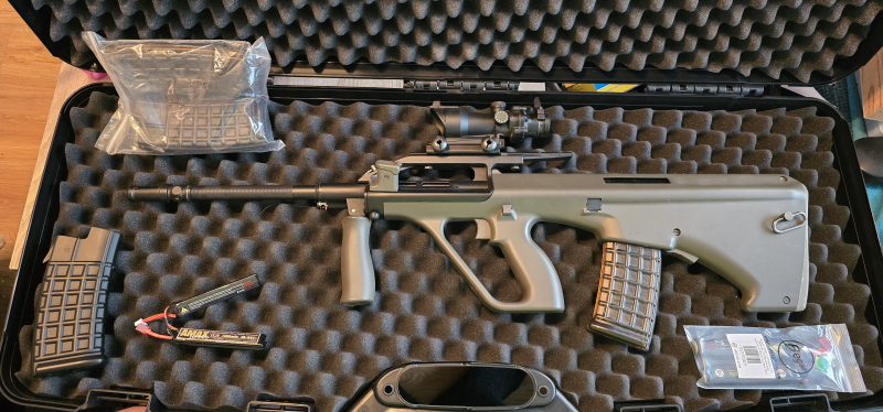 Hallo, biete hier eine Steyr AUG von Begadi JG S77 in 6mmBB in der S-AEG version. Waffe hat F zeichen. Die waffe ist aus Metall und Kunststoff, hat ein sattes Gewicht. Es funktionierte beim letzten test vor 1 jahr es hat eine kleine macke, es schießt soweit aber manchmal hakt es, man kann über begadi noch teile dafür es liegt wahrscheinlich an den inneren teilen der Zufuhr der kugeln, aber es schießt! kann es jetzt nicht ausprobieren da ich kein ladegerät mehr habe, Schaft ist verstellbar. Waffenkoffer ist inklusive, anleitung und zielfernrohr/red dot, akku ist dabei plus ladegerät. 3 magazine auch. Der Zustand ist gebraucht, sie hat aber so kaum gebrauchspuren.