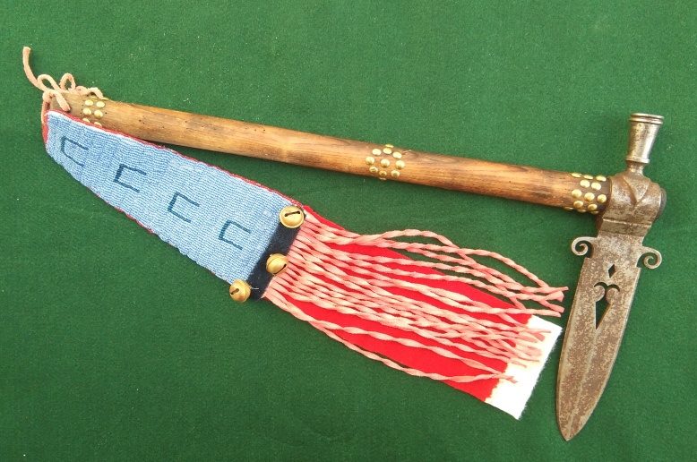 Älterer Indianer-Tomahawk mit besticktem Drop. Handgeschmiedet aus der gleichen Werkstatt wie Bild 4. Nur der Preis ist besser !