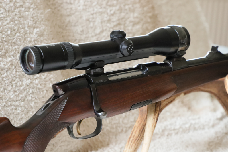 Sehr schöner und sehr gepflegter Steyr Mannlicher Luxus Stutzen im Kaliber 9.3x62 mit einem Zeiss Diavari ZM 1,5-6x42, das mittels einer sehr flach bauenden Suhler Einhakmontage montiert ist.