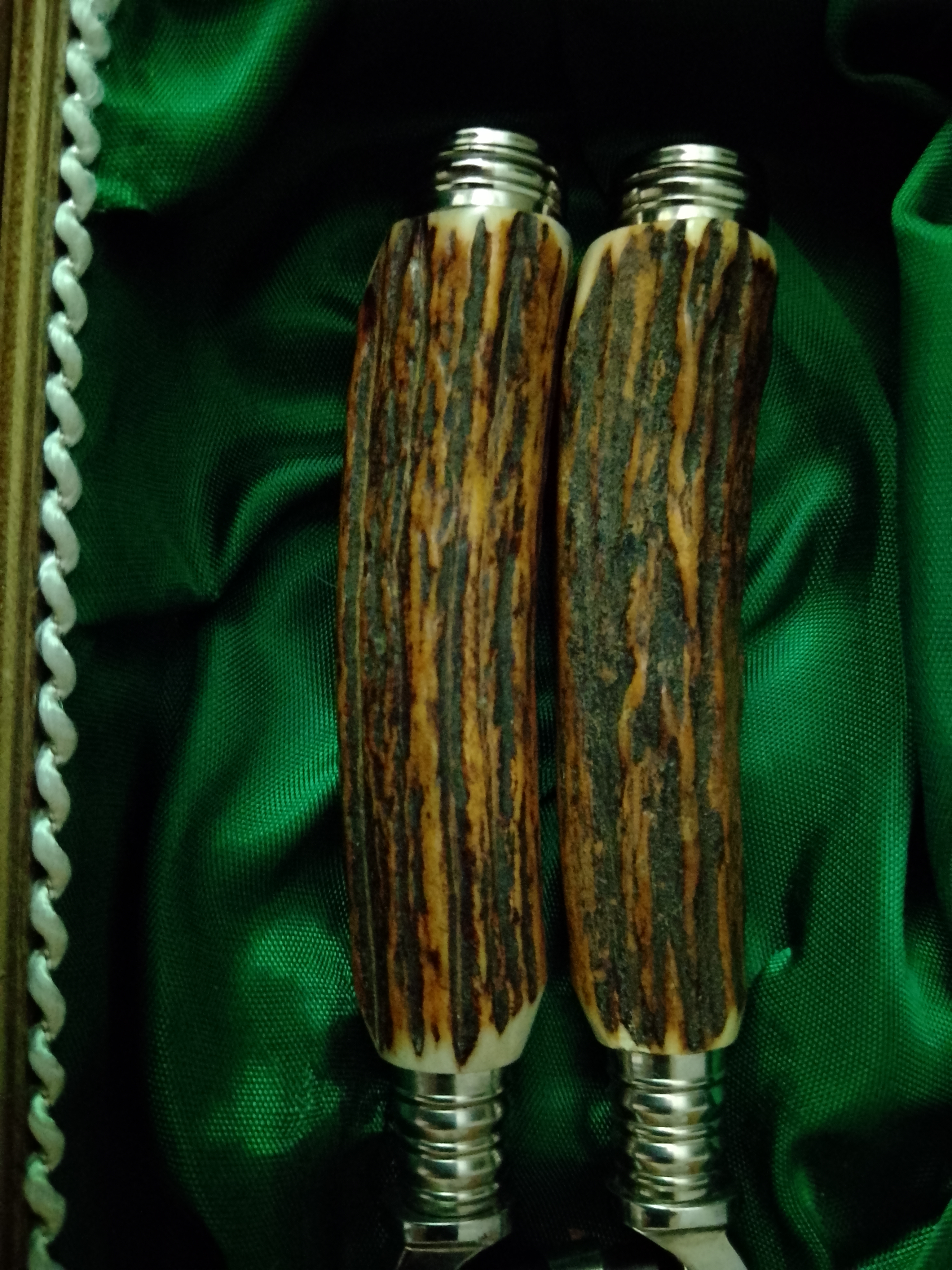 Jagd oder Tranchierbesteck Original in Holzkisten, mit grüner Seide ausgeschlagen, Griffe aus echtem Hirschhorn mit Edelstahl Zwingen,