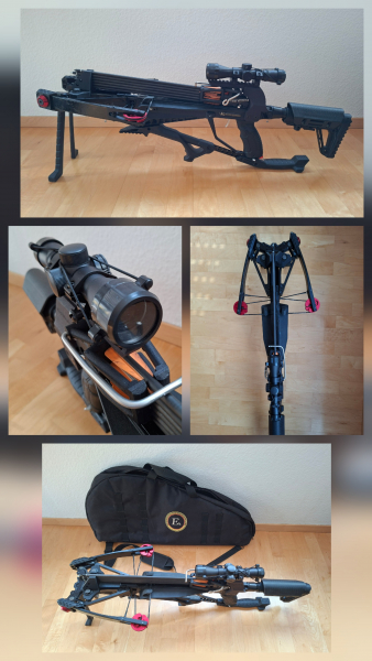 Ich biete meine Repetierarmbrust Siege 300 mit offenem Magazinaufsatz (50 % Carbon Anteil) und umfangreichem Zubehör zum Verkauf an.