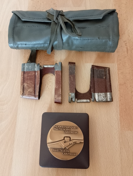 Konvolut bestehend aus einem original Putzzeug der schweizer Armee, sowie zwei Ladestreifen für GP 11 Munition für Karabiner und Langgewehre der Swiss Army, sowie einer sehr schönen Ehrengabe in Form einer Bronzemedaille. Das Putzzeug ist passend für alle schweizer Karabiner im Kaliber 7,5mm, wie auch für