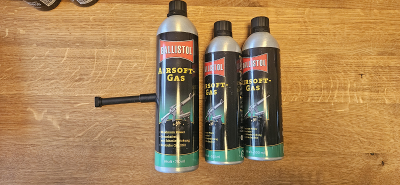 Zum Verkauf steht ein Set aus 3 Airsoft Gasflaschen von Ballistol in unterschiedlichen Größen sowie ein passender Adapter.