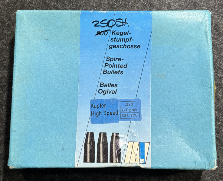 250 St. .323 Kegelstumpfgeschosse von Haendler & Natermann, verkupfert, durch lange Lagerung bereits angelaufen.