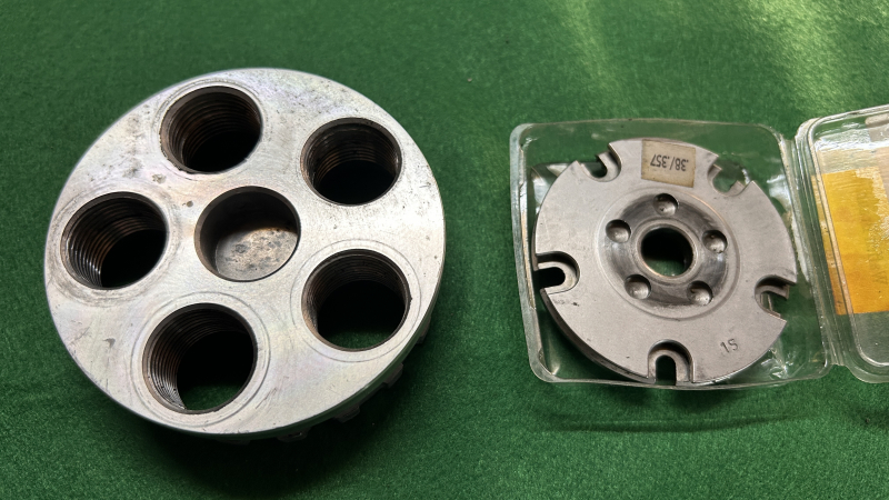 Biete eine gebrauchte Hülsenhalterplatte inkl. einer Kopfplatte für Matrizen (ohne Matrizen) der Kaliber .38 spezial/.357 Magnum für die Automatikpresse LEE Loadmaster an.
