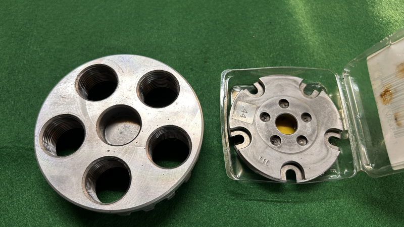 Biete eine gebrauchte Hülsenhalterplatte inkl. einer Kopfplatte für Matrizen (ohne Matrizen) des Kalibers .44 Magnum für die Automatikpresse LEE Loadmaster an.