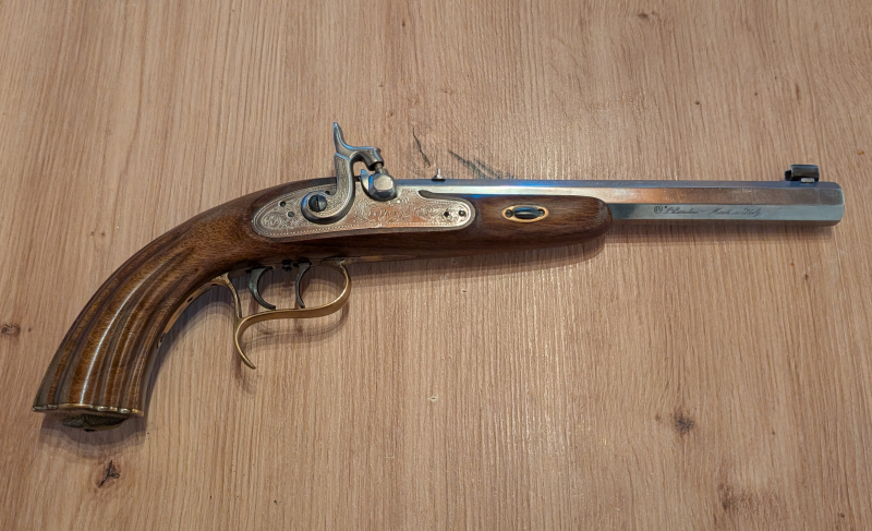 Angeboten wird hier eine Perkussionspistole Le Page vom Hersteller P. Bondini im Kaliber .36. Ist kaum geschossen worden mit blankem Lauf. Mit Stecher. Technisch einwandfrei. Lässt sich in beiden Positionen spannen. Mit italienischem Beschuss.