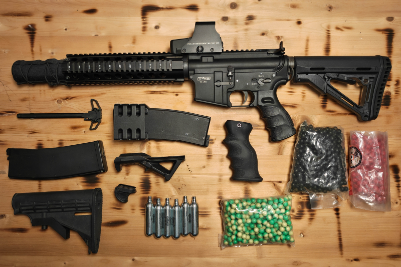 Läuft astrein, Mit geänderter Rail, 2 Magazinen, Schalldämpfer Atrappe mit Cover, verschiedenen Stocks und Griffen, Replica Raptor Ladehebel, paar CO2 Kartuschen sowie Paint-, Kreide- und Gummikugeln.