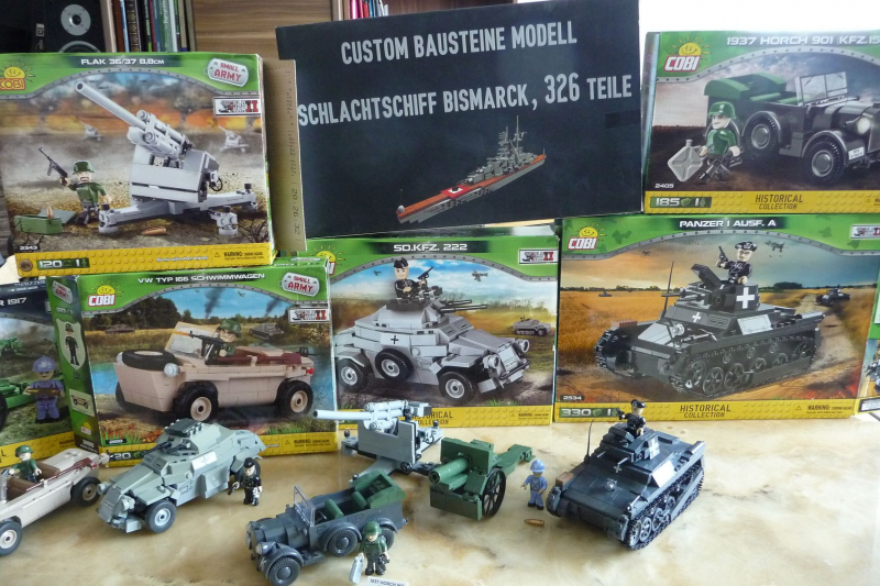 Watch out: No international shipping means no shipping to other countries as germany. No export. If you are highest bidder from other country as Germany you have to name a shipping address/ dealer in Germany. If you are bidding and no purchase is made, you have to pay the auction fees! Zum Verkauf kommen ein paar gebaute Klemmbaustein Modelle von Cobi und ein ungebauter Custom Bausatz Schlachtschiff Bismarck im Konvolut. Im Einzelnen: Cobi 2534 Panzer I Ausf. A mit Figur, Bauanleitung, OVP. Cobi 2405 1937 Horch 901 (Kfz 15) mit Figur, Bauanleitung, OVP Cobi 2366 SD Kfz 222 Panzerwagen mit Figur, Bauanleitung, OVP, einseitig ist der Kunsstoff leicht verfärbt wg Sonneneinstrahlung (stand lange auf der Fensterbank) Cobi 2188 VW Typ 166 Schwimmwagen mit Figur, Bauanleitung, OVP Cobi 2343 Flak 36/37 8,8 cm, Bauanleitung, OVP, Figur fehlt hier leider Cobi 2981 155mm Field Howitzer 1917, mit Figur Bauanleitung, OVP Custom Bausteine Modell Schlachtschiff Bismarck, 326 Teile, wurde nie aufgebaut Staubanhaftungen können vorhanden sein, Fehlteile habe ich bis auf die fehlende Figur bei der Flak keine feststellen können. Die Modelle werden alle aufgebaut, aber teilzerlegt versendet in der OVP. Nach Ablauf der Auktion erhalten Sie meine Kontodaten über E-Post. Da dies ein Privatverkauf ist, kann ich weder Garantie noch Rückgaberecht einräumen. Versendet wird nur innerhalb Deutschland als versichertes Paket nach Zahlungseingang des Käufers. Zahlung bitte innerhalb von 14 Tagen, ansonsten gilt der geschlossene Kaufvertrag als aufgelöst. Versandkosten von 7,70 € trägt der Käufer. Verkauf nur an Personen über 18 Jahre, Altersnachweis (Kopie Personalausweis) per Ablichtung, E-Post oder Post erbeten. Bei ID Mitgliedschaft erübrigt sich natürlich der Altersnachweis. Bieten Sie bitte nicht, wenn Sie mit diesen Bedingungen nicht einverstanden sind.