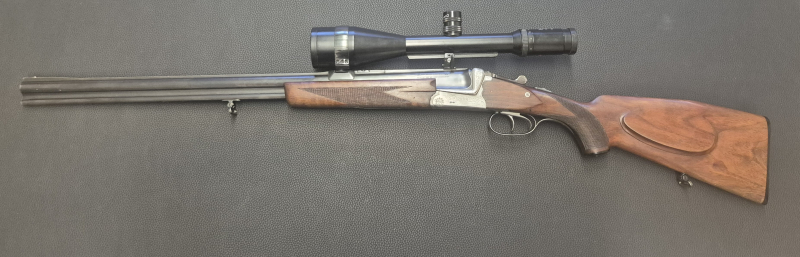 Sie bieten auf eine Bockbüchsflinte Sauer & Sohn Mod.54 Kal.7x57R 16/70 mit eingebautem Krieghoff Einstecklauf Kal.22WM 44cm lang mit Schlüssel zum Ausbauen. Das ZF Kahles 3-12x56 ist mit EAW Schwenkmontage montiert. Es ist möglich einen Nachtsichtvorsatz anzubringen.