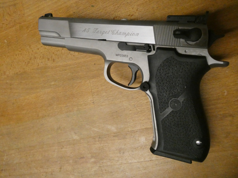 Biete eine Waffe für anspruchsvolle Schützen zum Kauf an, halbautomatische Pistole, Performance Center Smith & Wesson , Mod. Target Champion im Kal. .45 ACP. Top verarbeitete Waffe ohne jegliches Spiel, ausgestattet mit LPA Visierung, SA Abzugssystem ,Gummigriffschalen welche rutschfest in der Hand liegen und Abzugssicherung. Der 120 mm lange Lauf ist blank mit deutlichen Zügen. Im Lieferumfang sind insgesamt drei Magazine enthalten.
