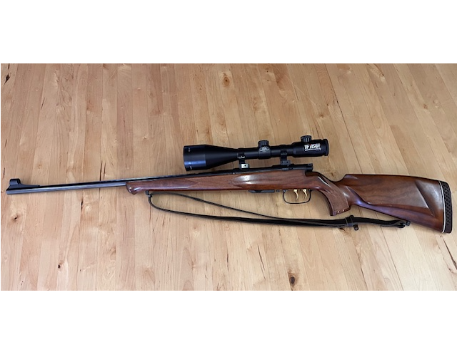 Anschütz Repetierbüchse mit deutschem Stecher und 3 Schuss Magazin. Lauf ist blank. Schöner Nußbaumschaft mit Fischhaut und geringen Gebrauchsspuren. (siehe dazu Bilder). Ulmer Beschuss. Es ist ein neuwertiges DD Optics Nachtfalke GenII 8x56 HDX montiert, mit iFiber-Control Leuchtpunkt.