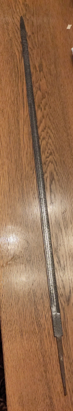 Ergänzung angefragter Maße: Länge Klinge ohne Angel 84,2 cm. Breite Klinge am Ansatz der Angel 19,2 cm. Klingendicke dort 5 mm. Breite Angel max. 11,3 mm. Dicke Angel max. 5 mm. Schmalste Stelle Angel (am Gewinde) 4,7 mm. Länge des Gewindestückes 14,3 mm.