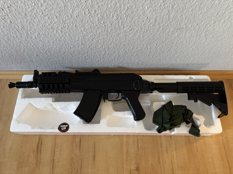 Ich verkaufe hier diese AK74M Subcarbine mit komplettem Zubehör als Voll/Teilautomatische AEG. Neupreis war ~120€, habe sie nur 2-3 genutzt, da es mir doch keinen Spaß gemacht hat bzw. ich das Interesse verloren habe. Funktioniert noch wie am ersten Tag, der Zustand ist auch noch ziemlich gut. Hop Up, Visierung und Schaft sind verstellbar. Modifizierungen lassen sich wohl auch noch vornehmen, die Mündung lässt sich abschrauben und darunter ist ein Gewinde. Akku funktioniert noch, hat aber über die Liegezeit wahrscheinlich schon etwas Verschleiß angesammelt.