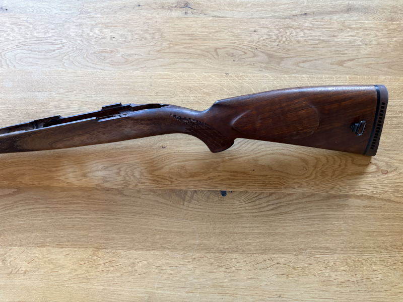 Der Schaft befindet sich in einem sehr guten Zustand.Lediglich am Rand der deutschen Backe befinden sich einige Druckstellen, wie auf den Bildern zu sehen ist. Der Schaft hat keine Risse oder anderweitige Beschädigungen. Schöne Maserung und sehr guter Maserungsverlauf. Pistolengriffkappe aus Kunststoff.