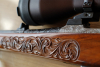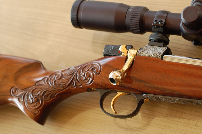 Luxusrepetierer von Brünner im Kal. 7 x 64, in den Brünner Waffenwerken mit aufwändiger Gravur von Lauf, Magazindeckel und System versehen. Die Bedienteile sind hartvergoldet. Der Schaft wurde von Künstlerhand wunderschön verschnitten. Mittels einer Schwenkmontage wurde ein lichtstarkes und klares ZF Falke 3 -12 x 56 (beleuchtet)  montiert. Das ZF ist wie neu und hat keine Kratzer usw.  Geamtl. 113 cm, Lauf 60 cm, Abzugslänge 37 cm.  Das Gewehr befindet sich im Bestzustand. Der Lauf ist natürlich blank, Zug-Feld Partie ist scharfkantig. Kaum geführt und sehr gute Schußleistung. Restmunition vorhanden. EWB muß nachgewiesen und mit scan dokumentiert werden. Tel. Nr. der Behörde.