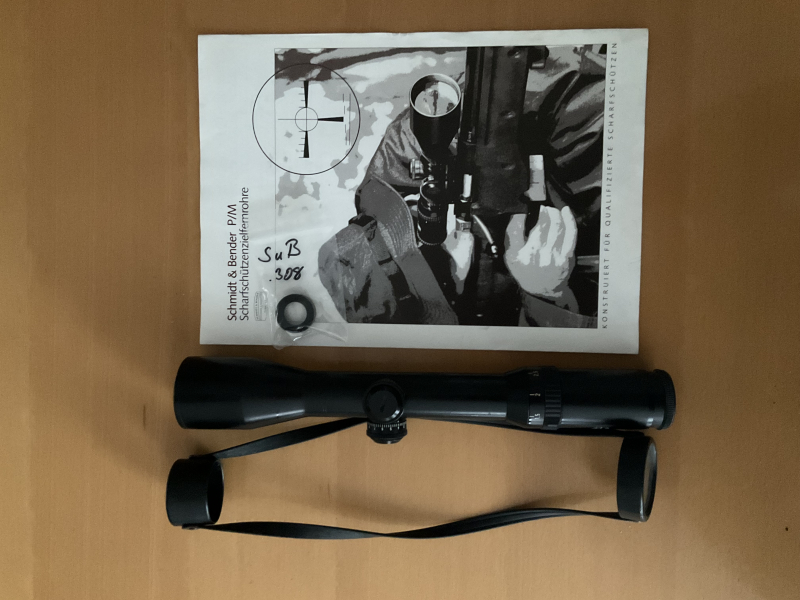 Schmidt&Bender P/M Scharfschützenzielfernrohr. 1,5-6x42; Absehen P-2 (Sniper); Leichte Montagespuren; Optik i.O.; Sehfeld 20-6,5m;Objektivdurchm. 42-21mm;Austrittspupille 14-7mm;Dämmerungszahl 4,5-15,8;Augenabstand 80mm; Mittelrohrd. 30mm; Objektivd. 50mm; Gesamtl. 310mm; Gewicht 450g;Höhenverstellringe universal Höhenverstellung 6,35mm/Klick + .308; Höhenverstellung 100-500m; Seitenverstellung @100yds 6,35mm/Klick; Angaben ohne Gewähr aus orig. Prospekt; Schutzabdeckung;
