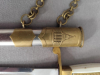 • Griffstück: Ergonomischer Griff aus weißem Kunststoff in Elfenbein-Optik. Die Parierstange, der Griffring, das Wickelband sowie der Knauf sind aus massivem, goldfarbenem Messing gefertigt.