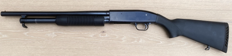 Es handelt sich um eine Repetier-Flinte Maverick im Kaliber 12/76, schwarzer Kunststoffschaft.