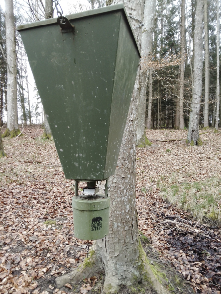 Der Futtertrichter wurde extra aus Massivem Stahlblech mit Stahlblechdeckel angefertigt (Fassungsvermögen ca. 50l) Das Kirr material bleibt über viele Wochen auch bei Dauerregen trocken. Mit dabei sind noch zwei lange Ketten, um den Automaten zwischen zwei Bäumen zu befestigen, guter Zustand.