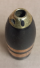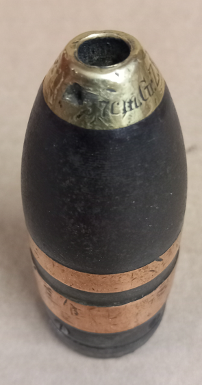 Seltener deutscher Übungs-Projektil aus dem 1. Weltkrieg; der Zünder ist mit einem Stift am Projektil fixiert, die Schrauben am Boden dienen zur Befestigung der Kartusche.
