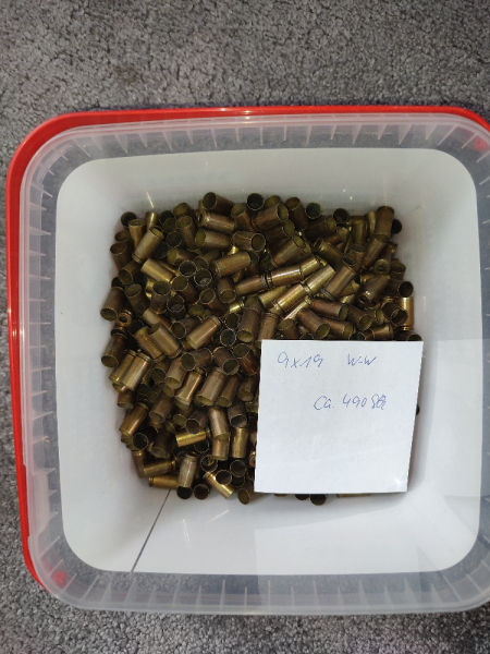 Ich muss aufräumen. Sie bieten auf ca. 490 abgeschossene Boxerhülsen im Kaliber 9x19 Fabr. W-W. Die Hülsen sind vollkalibriert, entzündert und sind von mir ca. 2-3 mal wiedergeladen worden. Die Menge wurde über das Gewicht (1,66kg) bestimmt. Die Hülsen sind relativ dünnwandig (ca. 0,20 bis 0,25mm) am Hülsenrand, andere Fabrikate (CBC, S&B, Norma etc.) liegen bei 0,30 bis 0,36mm. Ich hatte sie seinerzeit benutzt um .358 Geschosse zu verladen ohne das die Hülsen zu sehr aufbauchen und dann nicht mehr einwandfrei zuführen. Bitte beachten Sie auch meine anderen Auktionen und mein myGun.
