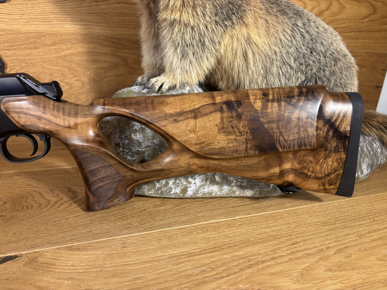 Die Jagd verlangt nach Ruhe und absoluter Kontrolle – hier zeigt der Iconic Lochschaft seine Stärke. Mit moderner geschwungener Linienführung und klassisch anmutendem Design begeistert er ab dem ersten Augenblick. Jede Kontur, jede Kante ist Ausdruck vollendeter Präzision. Das optimierte Daumenloch unterstützt das Einfädeln beim Repetieren. In Kombination mit dem steilen Pistolengriff und dem ausgeprägten Palmswell führt der Schaft den Finger fast von allein zum Abzug. So entsteht ein Anschlag, der sich so selbstverständlich anfühlt wie ein Atemzug. Der Sauer Iconic Lochschaft – ein Meisterwerk in Design und Funktion, das schon vor dem ersten Schuss fasziniert.