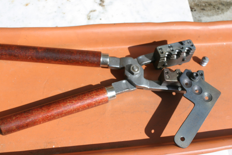 Aus grossem Nachlass---s Foto-- 3Fachkokille eines unbek Herstellers ---WER KENNT DAS TEIL? --gestempelt 10,5 -- das beiliegende geschoss hat 10,9 g oder 169 grs und 10,6 mm diameter---scheint kaum benutzt --montiert auf einem gr. RCBS Kokillengriff --ein schweres und solides Teil --