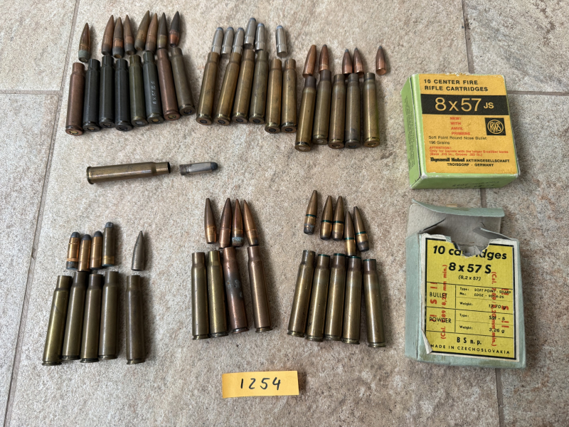 Sie bieten hier auf die abgebildeten Hülsen und Geschosse Kaliber 8x57mm. Es ist eine bunte Mischung verschiedener Epochen. Selten angeboten, Hülsen Zündhütchen intakt. Die Patrone in der Mitte ist eine 8x57R. Die abgebildeten Schachteln sind leer und werden mitgeliefert.