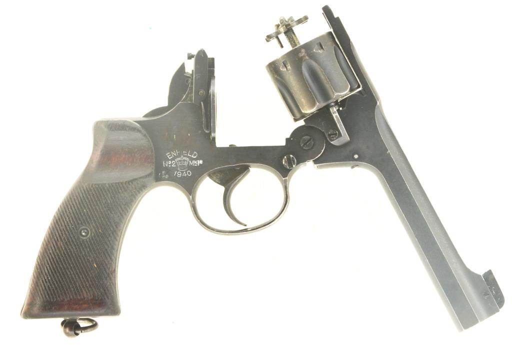 Baujahr "41" und Kaliberangabe ""CAL. 38") oben auf dem Lauf, Seriennummer, britische Prüfzeichen und Beschusszeichen „BNP“, Baujahr auf dem Griffstück rechts datiert „42“, unter "ENFIELD No. 2 Mk. I*" mit mittiger Krone. Armeeeigentumsstempel „Broad-Arrow“. Trommel beschriftet "ESC.199" (= english steel corporation batch identification).