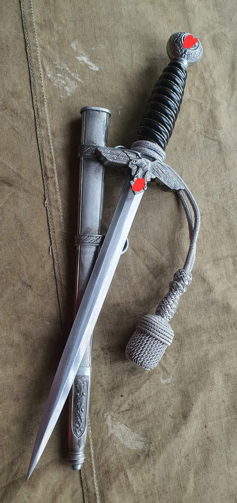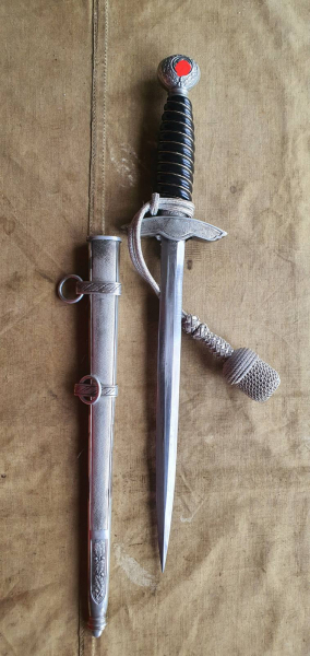 Luftwaffe-Dolch, guter Zustand. Ausführung mit Stahlklinge und Herstellerkennzeichnung „Ritterkopf“. Altersbedingte Gebrauchsspuren vorhanden, insgesamt jedoch ein ordentlicher und sammelwürdiger Zustand. Die Klinge weist eine altersentsprechende Patina auf. Griff, Parierstange und Scheide befinden sich in einem dem Alter entsprechenden Gesamtzustand.