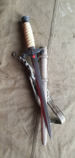 Offiziersdolch, guter Zustand. Ausführung mit Stahlklinge und Herstellerkennzeichnung „Solingen“. Altersbedingte Gebrauchsspuren vorhanden, insgesamt jedoch ein ordentlicher und sammelwürdiger Zustand. Die Klinge weist eine altersentsprechende Patina auf. Griff, Parierstange und Scheide befinden sich in einem dem Alter entsprechenden Gesamtzustand.