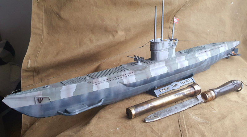 Das Messer hat mich persönlich so beeindruckt, dass ich eine passende U-Boot-Modellunterlage (ca. 83 cm Länge) dazu erworben habe. Auf Wunsch kann dieses Modell zusätzlich zusammen mit dem Messer erworben werden (+100 € zum Kaufpreis).